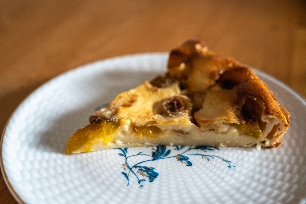 Il était temps de sortir du congélateur les reine-claude du jardin cueillies il y a un mois. J’en ai fait une flaugnarde – ou un clafoutis, appelez-ça comme vous voulez – mais en changeant la recette pour utiliser des blancs d’oeufs : un oeuf, 3 blancs, 120g de farine, 30cl de lait, 3 cuillère à soupe de sucre ; ça a très bien marché. Le flan était un peu plus compact, mais ça passait très bien.