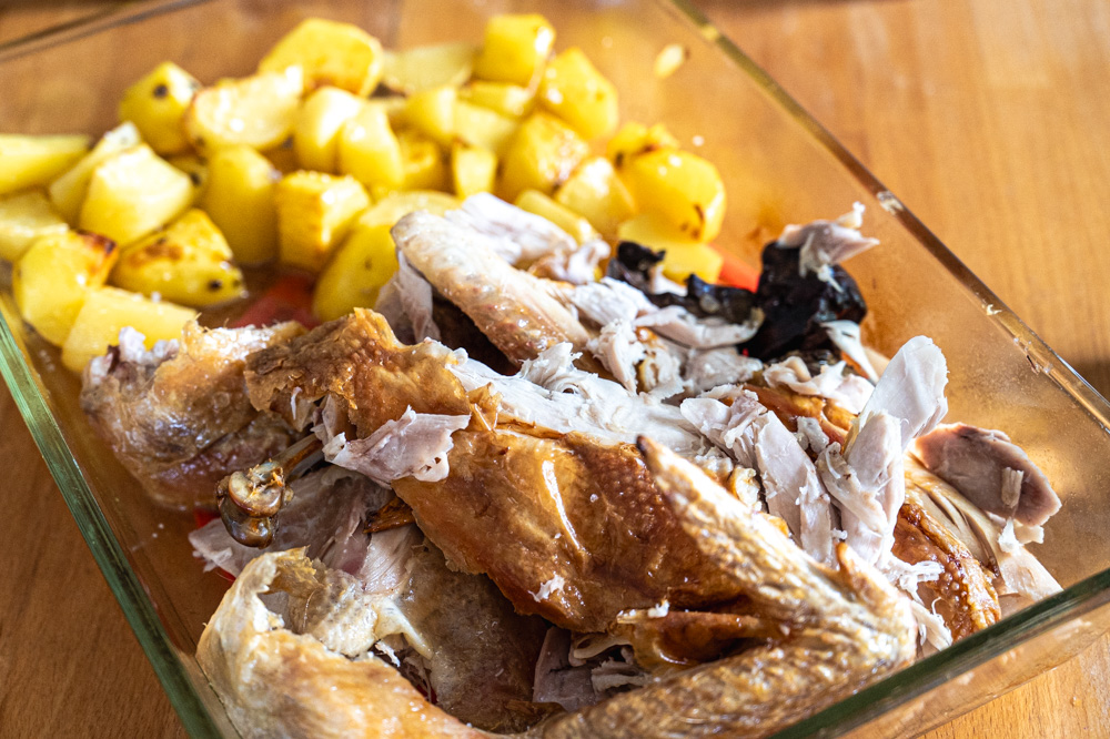 - dimanche midi : poulet et ses pommes de terres rôtis, ratatouille au four ; flaugnarde aux prunes
