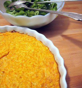 La tarte est servie ici avec une salade de mâche et vinaigrette miel (1/2 cuillère à café), vinaigre de cidre (une cuillère à soupe), huile d’olive (2 cuillères à soupe) et une petite pincée de curry, sel et poivre.