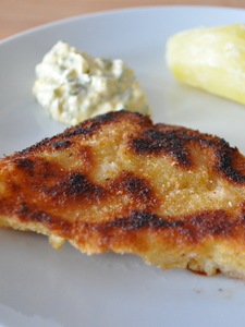 Poisson pané et sauce style tartareDepuis quelques temps, je fais régulièrement de la chapelure en « blendant » mon pain dur, chapelure qu’il faut bien évidemment utiliser. Il fut un temps où chaque samedi midi, nous mangions des escalopes de veau, souvent panées. J’ai revu le principe avec du poisson. Ne zappez pas la sauce (remplacez éventuellement  la mayonnaise par du fromage blanc), c’est ce qui fait tout le charme de ce poisson.