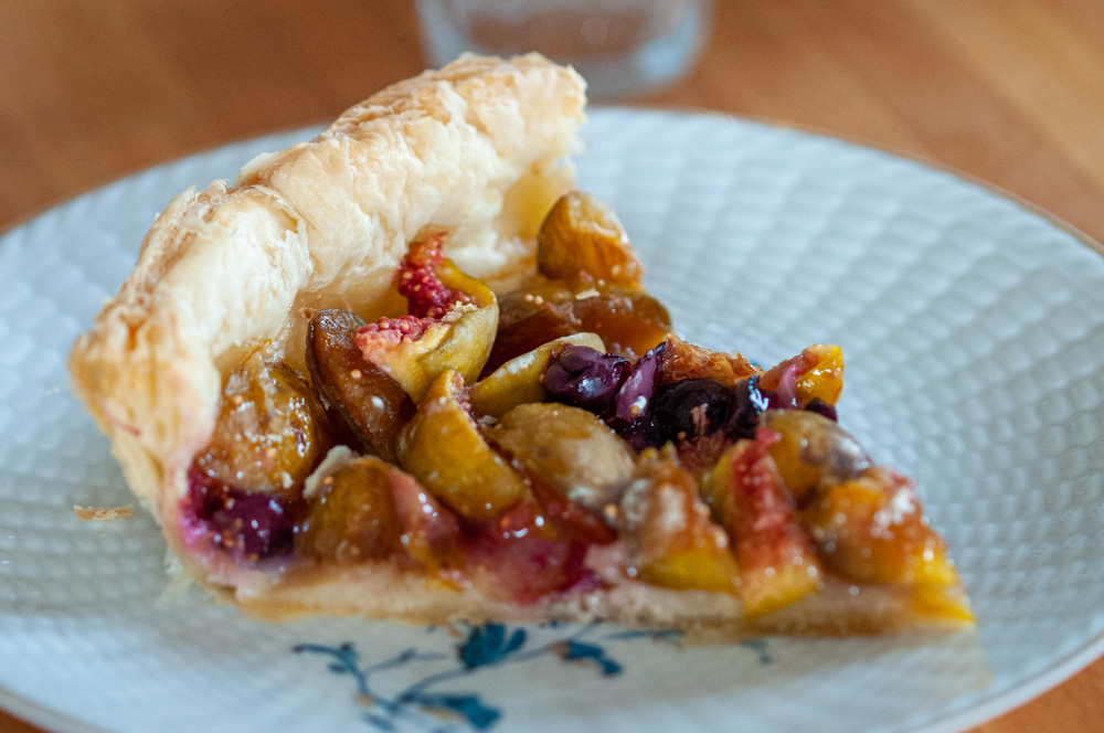 - dimanche midi : osso buco (en cocotte, cuit au four) ; polenta ; tarte d’automne (reine-claude, raisins, figues), avec une pâte feuilletée du commerce et la garniture inspirée de cette tarte rustique prunes et raisins