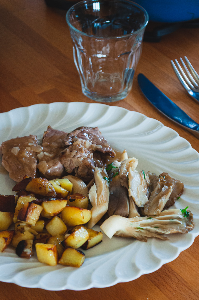 - dimanche midi : rôti de veau aux pleurotes, pomme de terre sautées ; tarte aux pommes dont j’ai zappé la pomme râpée et faite avec la compote de pomme maison stérilisée
