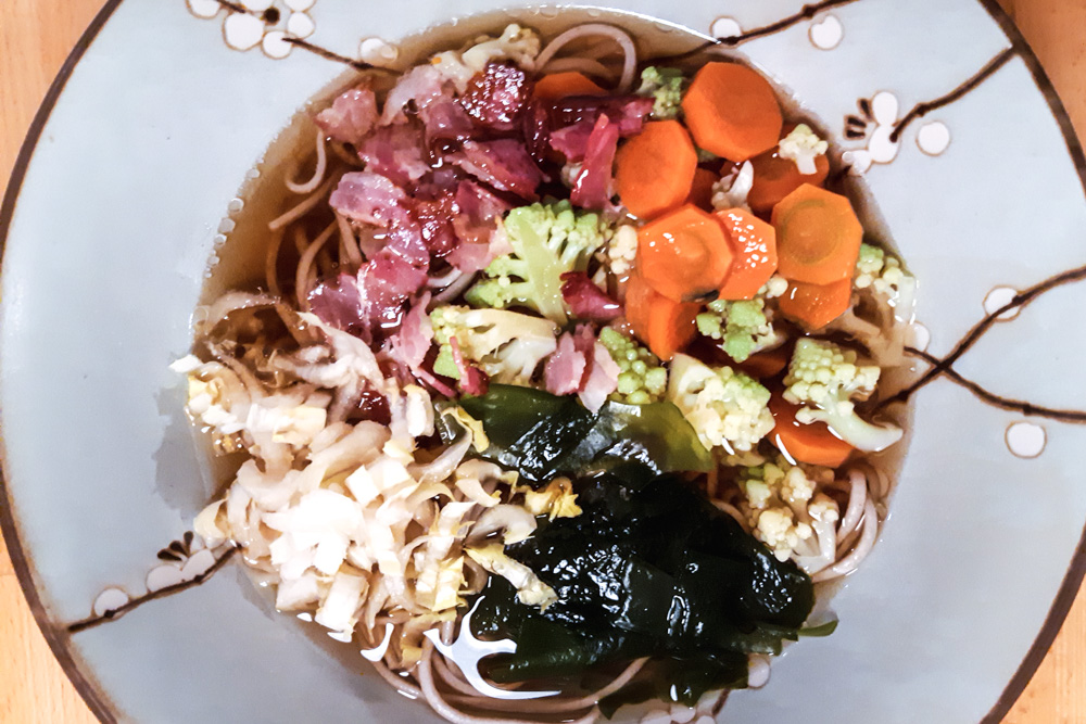 On mange souvent des soupes d’inspiration japonaise, alors j’ai pensé qu’il serait intéressant de vous donner un petit aperçu de celles que nous mangeons. Il ne s’agit pas de soupes réellement japonaises, mais plutôt de notre interprétation des ramens, soupes de udon ou soba avec nos ingrédients. Ainsi, les mélanges que nous faisons n’ont peut-être rien à voir avec ce qui se pratique au Japon … mais on aime nos soupes, donc allons-y pour quelques explications.
