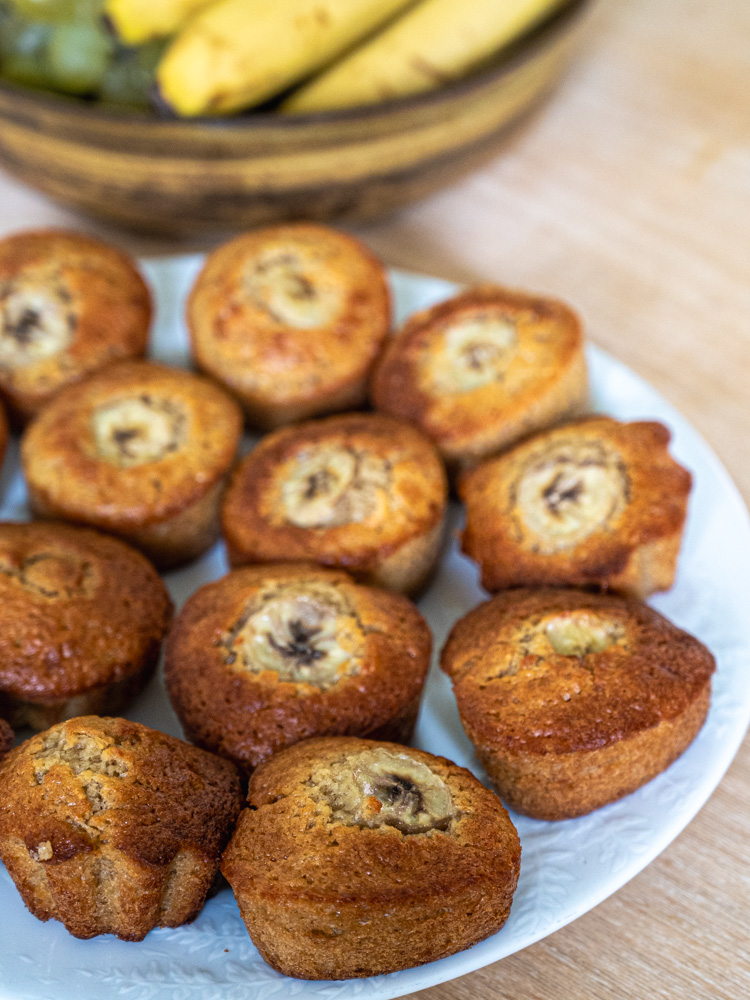 Alerte bananes ! Le primeur nous a donné des bananes en fin de vie : c’est bien pratique, car en ce moment, nous avons une consommation régulière d’une banane par jour, mais là, ça faisait quand même un peu trop. Ni une ni deux : c’est parti pour des banana bread en mode muffins. En faisant des gâteaux individuels, cela m’a permis de faire moitié nature (juste banane) et moitié parfumés au gingembre, que tout le monde n’apprécie pas.