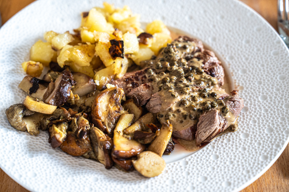 - dimanche midi : steak sauce au poivre vert, pommes de terres sautées, cèpes poêlés à l’ail ; banana bread au gingembre