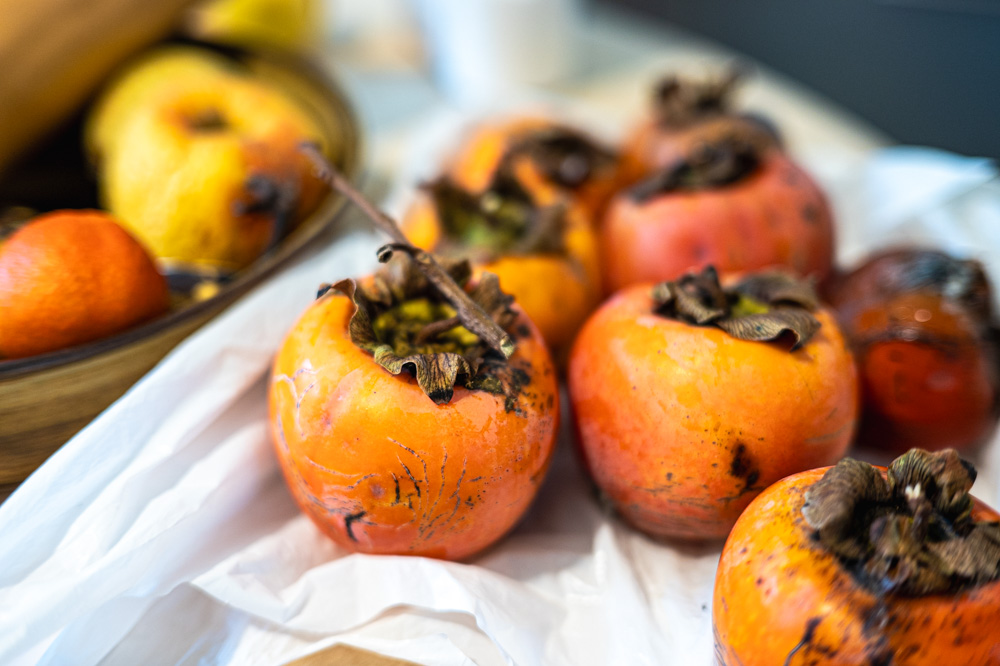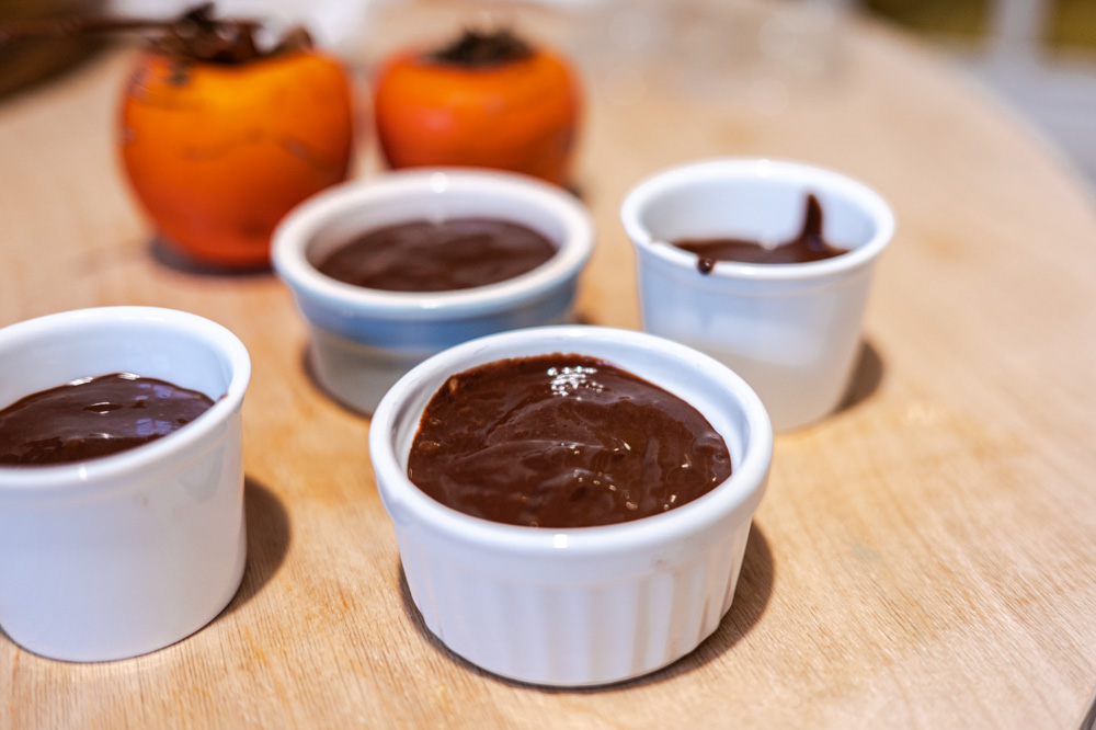 Après les prunes, les figues, les coings… voici les kakis ! Les voisins ont un plaqueminier dans leur jardin et cette année, il donne énormément. Il y a eu les premières gelées et les fruits sont très mûrs. On en a mangé à la petite cuillère la semaine passée, mais il en restait beaucoup, et ils commençaient à être très abîmés. J’ai donc fait trois recettes : un cake aux pépites de chocolat, un gâteau à la cannelle et des crèmes au chocolat « deux ingrédients » : je les avais testées il y a deux ans, mais les kakis étaient un peu trop râpeux. J’espère qu’avec ceux vraiment très mûrs de cette année ça sera plus réussi !