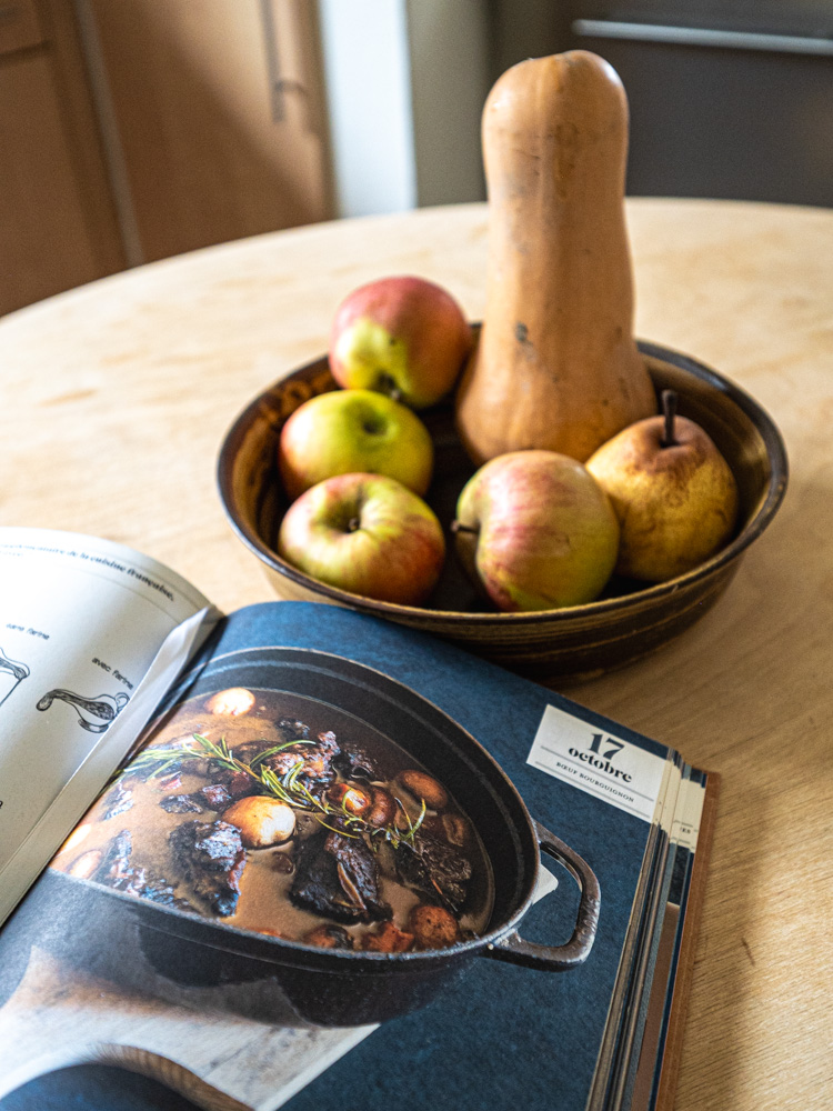 J’ai changé de recette de bourguignon : au lieu celle du Larousse de la cuisine, j’ai pris celle de Stéphane Raynaud dans « 365 bonnes raisons de passer à table ». Il fait cuire ça en cocotte au four, met une cuillère à soupe de farine (sacrilège!), du fond de veau, du romarin, et en bon petit-fils d’Ardéchois, du vin du Rhône. Comme par ici, en Isère, où tout le monde ne jure que par le côte du Rhône. Pour ma part, j’ai repris la cocotte, le four, la farine, le romarin, le fond de veau – qui était périmé – et j’ai mis … du côte du Roussillon. D’habitude, je prends du Cahors, mais on avait une bouteille de rouge déjà entamée.